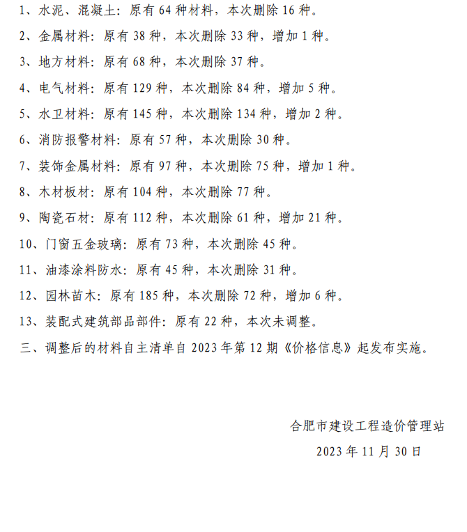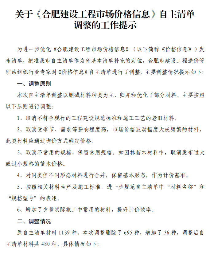 关于《合肥建设工程市场价格信息》自主清单调整的工作提示