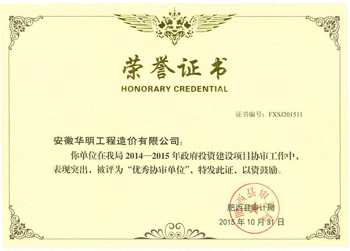 2014-2015年度被肥西县审计局评为“优秀协审单位”